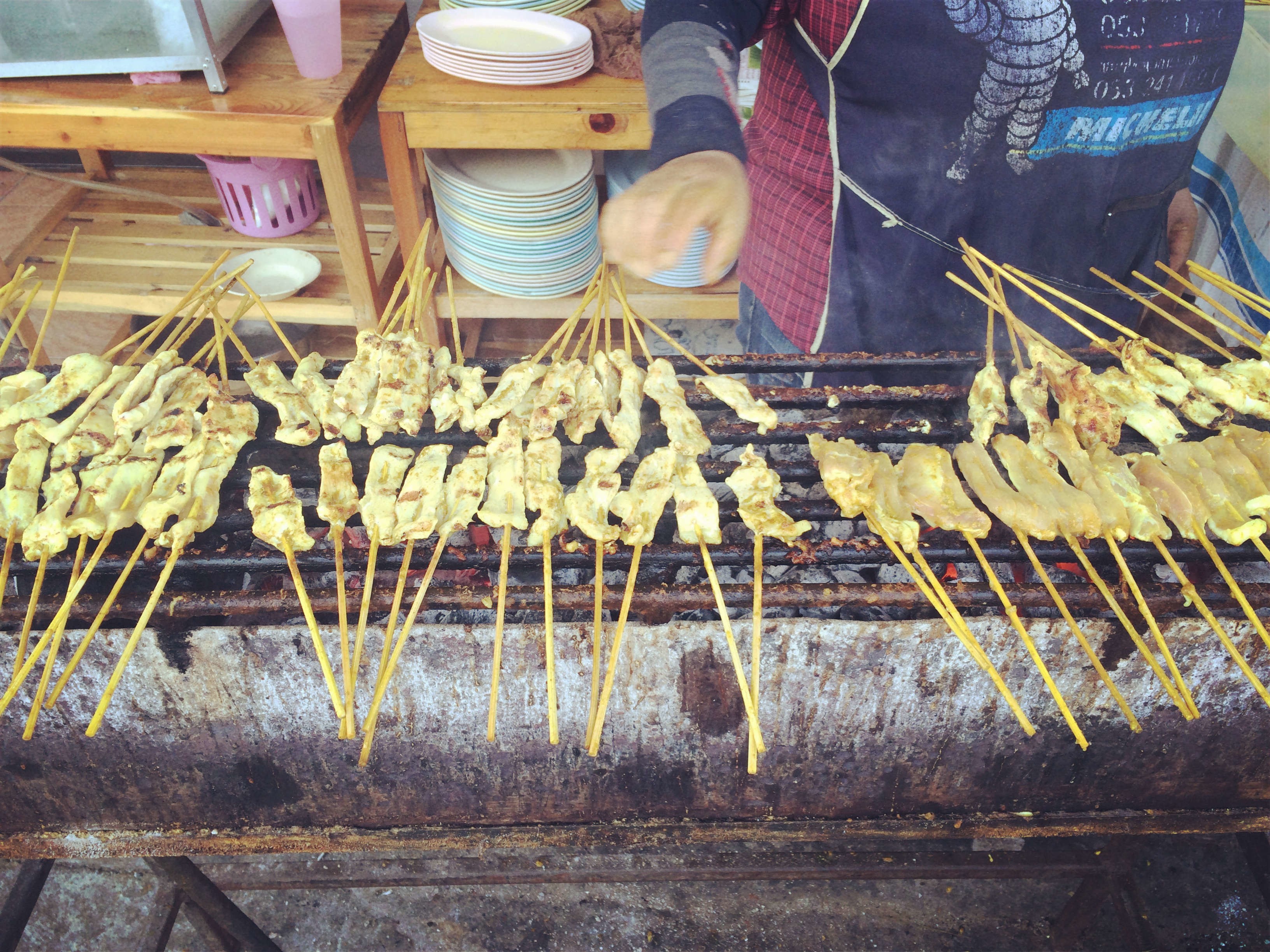 泰国的烤鸡可以做成各种味道和各种方式来烤,整只的烤鸡会更香一些,而这种烤鸡肉串只适合嘴馋时随便来几串解解馋。