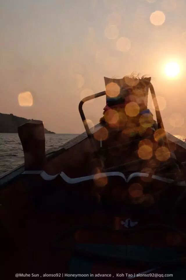 浮潜时后背一定要照顾好!要么穿长袖,要么整个全身都要穿潜水服!在出海浮潜时最好不要在黄昏,因为黄昏之前海水中光线不足,不便于我们在水中观察鱼类。在黄昏时分回程不错,可以在海上观看日落,如下图: