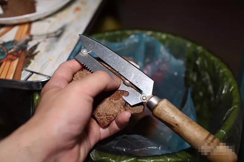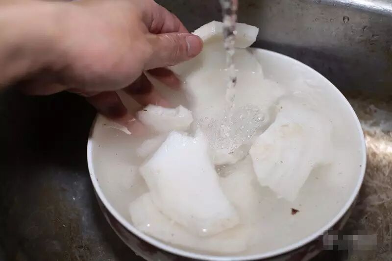 2、接着才是劈开椰子,地上先垫一层胶纸,选比较粗糙的地面,用尖处劈开一个小口子,之后用刀背敲打外壳,让肉脱落下来。之后再洗净肉,削皮切片备用。