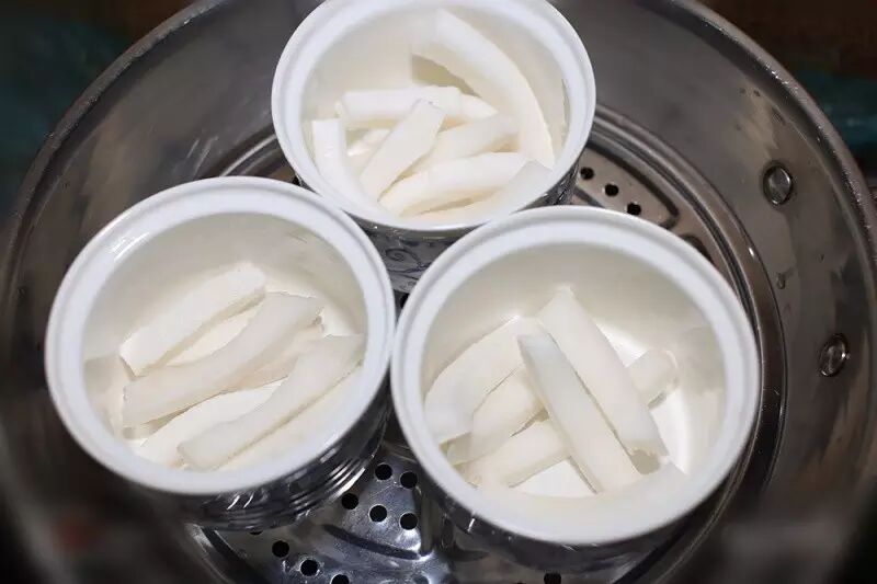 3、准备好了,把椰肉放炖盅,上面再放鸡肉,最后放配料,之前准备好的椰汁倒上,烧开之后再隔水炖1个半小时即可。