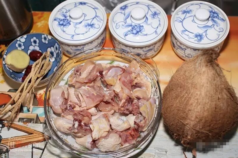 母鸡半小只、椰子一个、党参、红枣三个、姜片少许、枸杞适量。