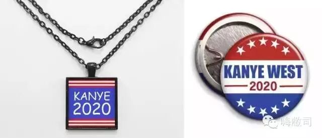 除了服饰外,网友们还设计出与侃爷街头气质相配的配饰如吊饰、胸针等,甚至部分已经开卖了!如果你真的支持侃爷的话,你一定要赶紧入手一件,不过笔者建议要等到侃爷确定参选了才好好谋划也不迟,因为按侃爷的性格,到时候肯定有比 Yeezy 350 更劲爆的单品释出。只是不知道侃爷是共和党还是民主党呢?