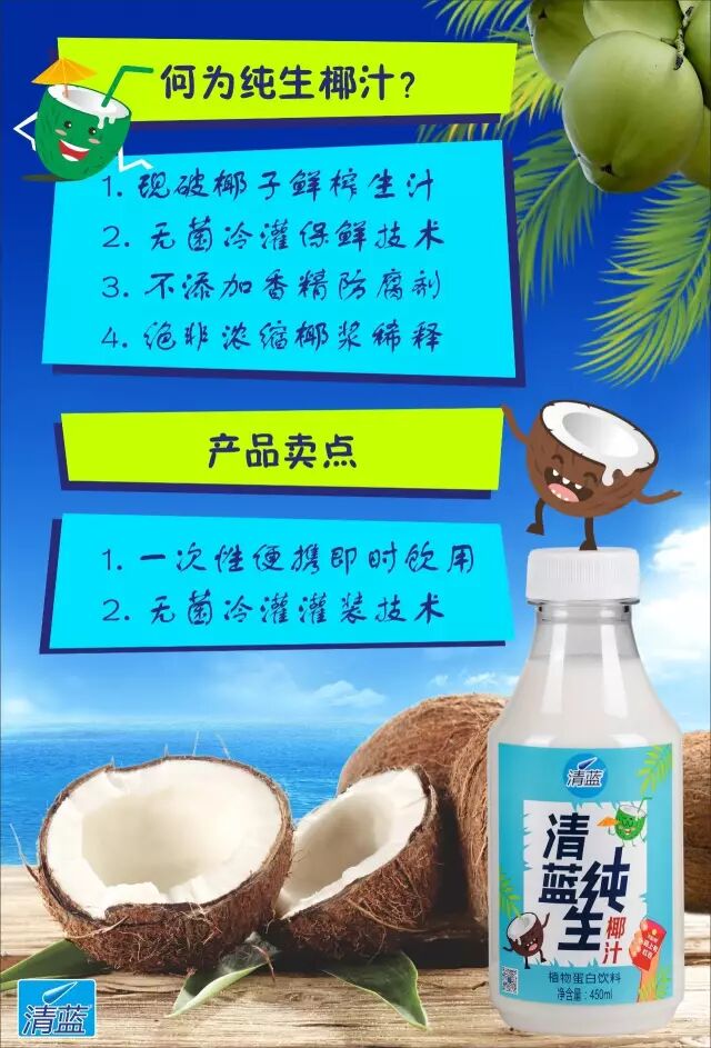 热灌装是传统后杀菌工序,采用封膜的生产工艺,造成消费者饮用不便,使得现有的便携小瓶装椰汁在终端渠道难以爆量。目前最先进的无菌冷灌设备生产工艺可以解决不用封膜又能保持鲜味与营养的品质,无疑是一个巨大商机。清蓝又一次斥巨资引进无菌冷灌装设备,开发450ML的便携式纯生椰汁,也是国内第一支以纯生为概念的椰汁。