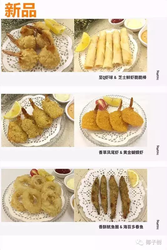 至Q虾球、香草凤尾虾、黄金蝴蝶虾、芝士鲜虾脆脆棒、香酥鱿鱼圈、海苔多春鱼。