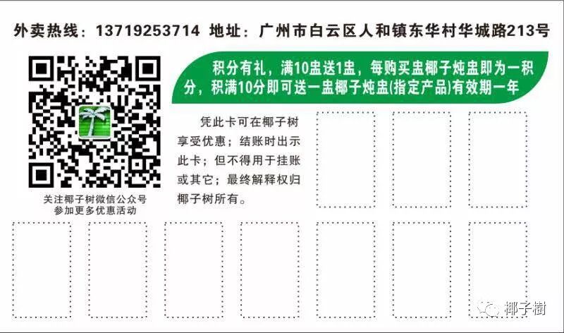 每次购买原只椰子炖品即为1分,积满10分即送原只椰子炖乌鸡或椰子炖蛋