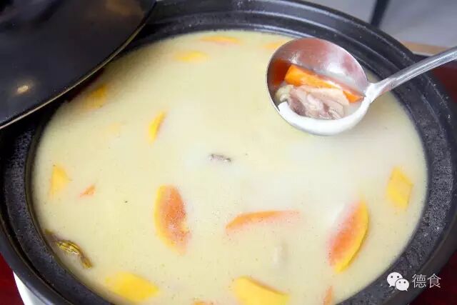 做这个菜选用“粟米鸡”,将鸡起骨后,把骨头、胡萝卜、椰子肉,汤放进高压锅压10-20分钟,作为汤底,将鸡肉斩件,放进汤底中煮到刚熟,最后再放入木瓜滚一滚,就可以开锅吃了!