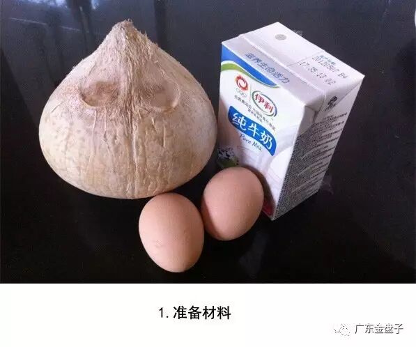 材料:椰青1个、鸡蛋2个、纯牛奶250ml、白糖5g