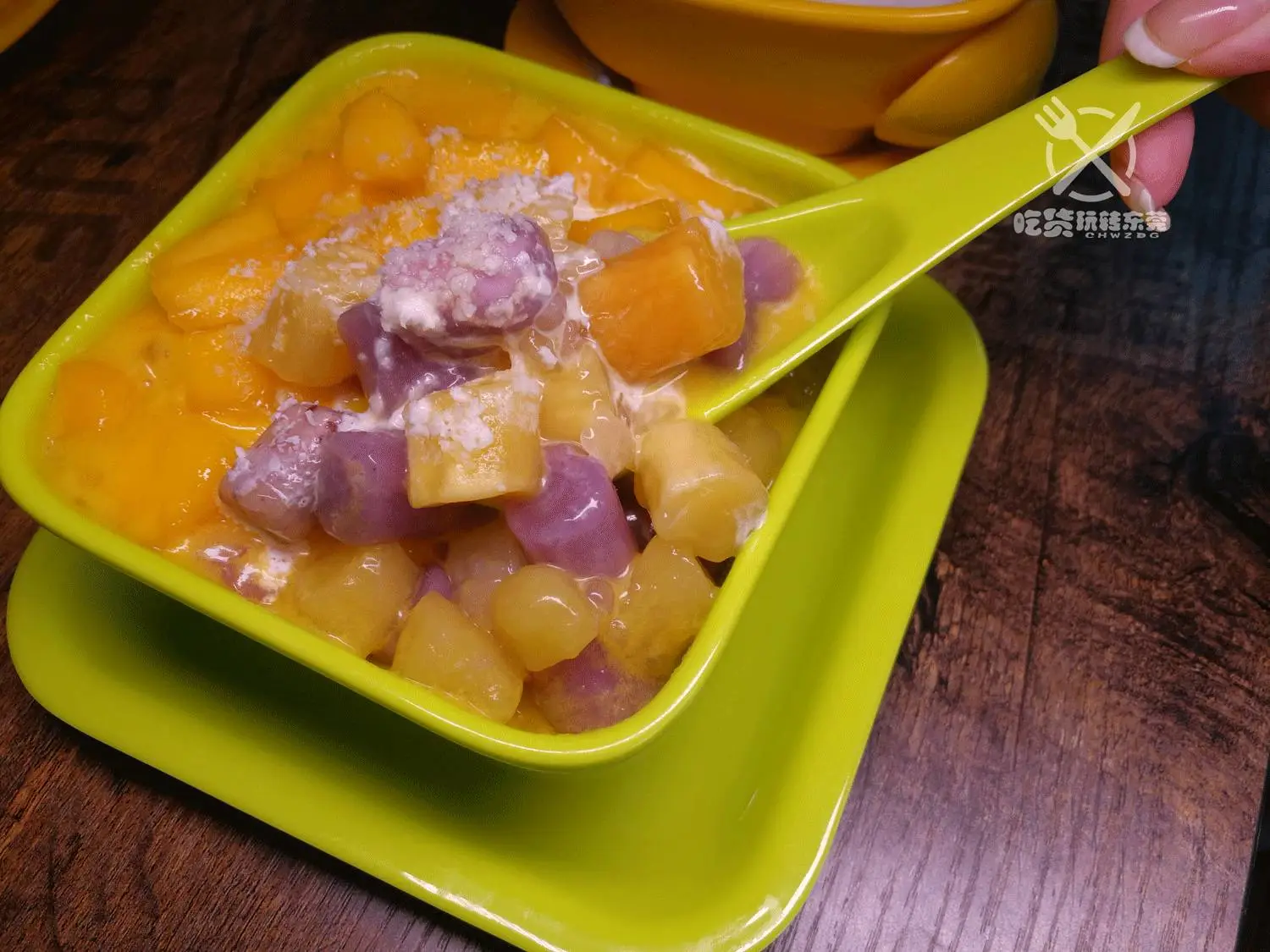 这个用芒果做的甜品,有杨枝甘露的影子,不过这个口感会丰富点!
