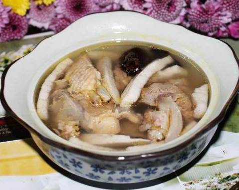 1、鸡块去皮,猪骨处理干净,切姜三片一起备用;红枣去核备用;
