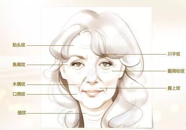 静态皱纹指面部在不做任何表情时,便可直观观察到的皱纹如眼周纹、泪沟、额纹、法令纹、嘴角纹、川字纹等。
