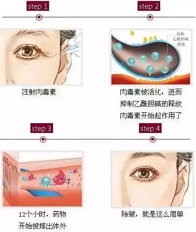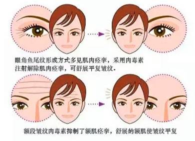 肉毒素的除皱原理:造成皱纹的肌肉麻痹,舒展皱纹,解除肌肉痉挛,笑起来的时候肌肉不动,自然也就减轻甚至去除了皱纹!