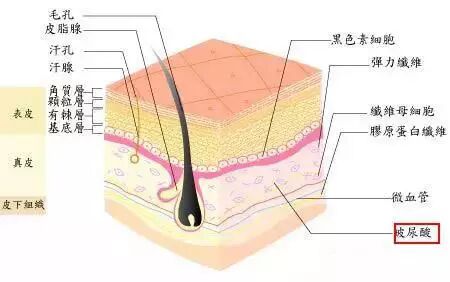 玻尿酸,位于人体的真皮层中,大概就在这个位置↓↓↓