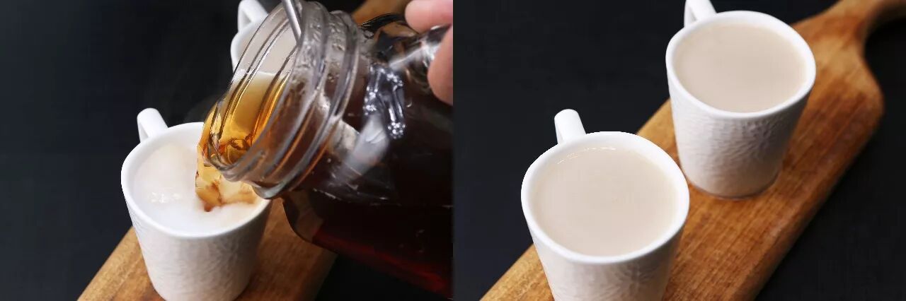 准备好一杯茶和一杯椰汁,先在杯中倒入椰汁再倒入茶,椰茶就制作好了