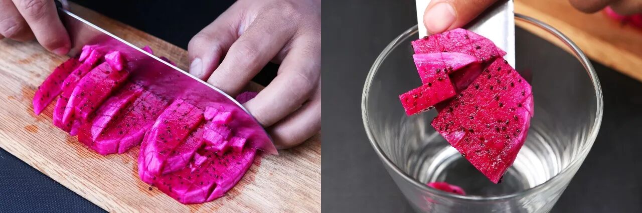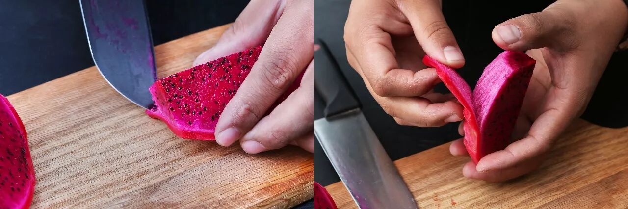 火龙果切开,用刀将皮和果肉分开,撕去外皮