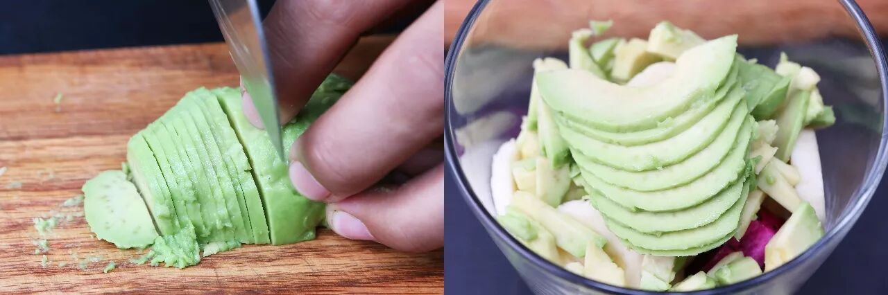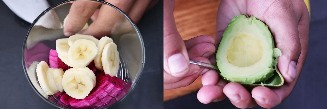 切好的粉蕉片放入杯中,牛油果对半划开祛核用勺子挖出果肉