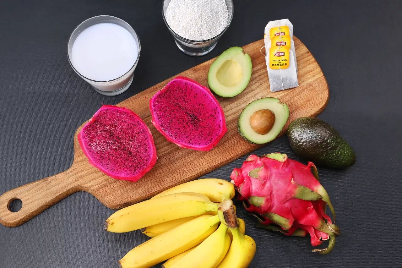 红心火龙果一个、粉蕉两个、牛油果一颗