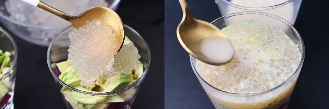 舀上几勺西米露,最后将煮好的椰茶倒入杯中