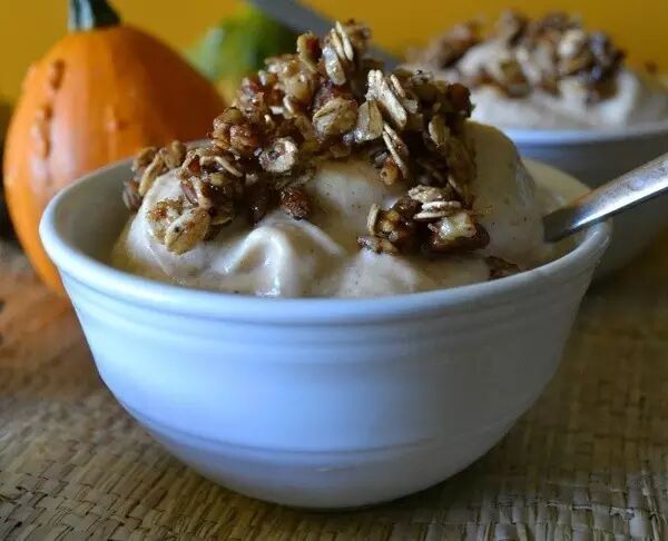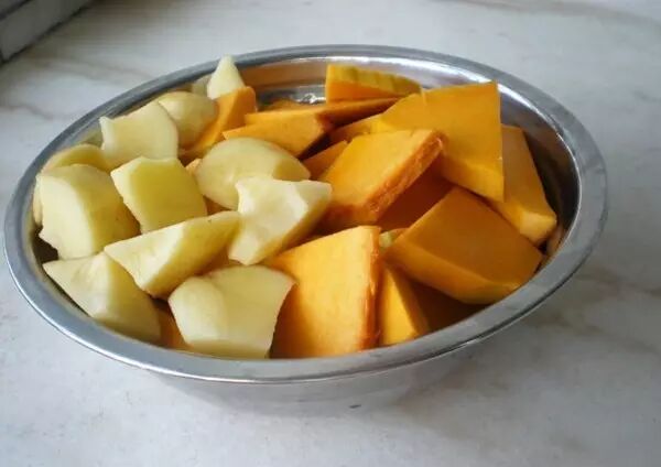 冰淇淋主要食材:切片冰香蕉 3根、切片去芯冰的甜苹果 1个、冰冻的切片烤地瓜1杯、非乳制品奶(豆奶) 1杯、香草粉 1茶匙、肉桂 1茶匙、小豆蔻 1/4茶匙、姜末 1/4茶匙、五香粉