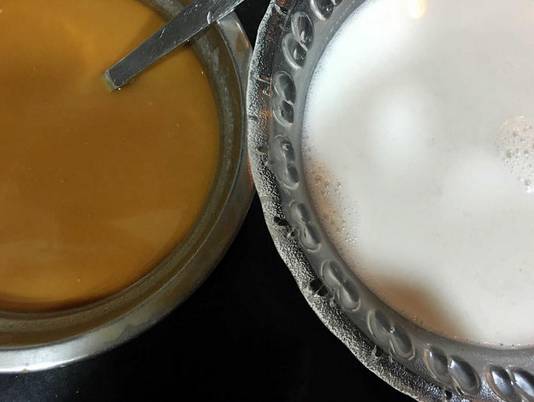 第一层先用步骤2已搅拌均匀噶浆(大约两大勺,不要太多)每层大概3-4分钟左右,凝固后如果有水,需要倒出来。