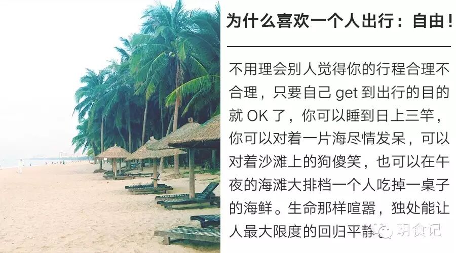 所以,为什么喜欢一个人出行的好处就凸显了:自由!不用理会别人觉得你的行程合理不合理,只要自己get到出行的目的就OK了,你可以睡到日上三竿,你可以对着一片海尽情发呆,可以对着沙滩上的狗傻笑,也可以在午夜的海滩大排档一个人吃掉一桌子的海鲜。生命那样喧嚣,独处能让人最大限度的回归平静。