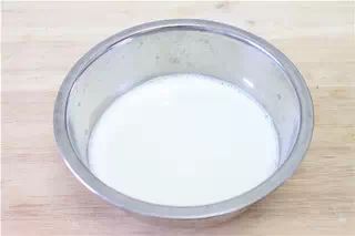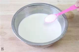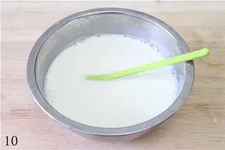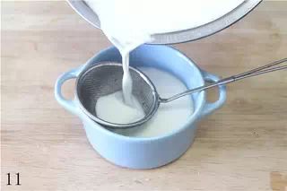 9、蛋清过筛网倒入牛奶里,气泡过滤掉。