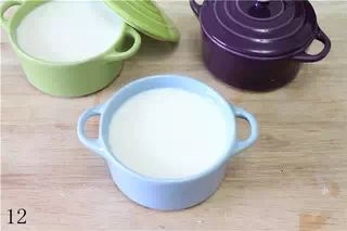 11、牛奶蛋清液过筛网,慢慢倒入小碗里,使第一次形成的奶皮浮到表面。