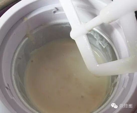 ④冰激凌机先运行,设定20分钟,顺着投料口倒入液体;冰激凌桶需提前冷冻;