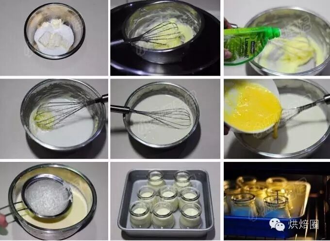 ⑧把布丁液加入到布丁瓶中,模具内放水,放奶瓶的模具最好深一些,让水能至少没过奶瓶的二分之一;