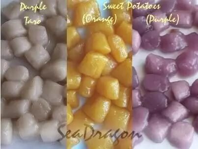 ④锅里水煮开,下芋圆,煮到芋圆浮起,再继续煮2-3分钟,就可以捞出来,配上你喜欢的各种甜汤,开始嚼吧。