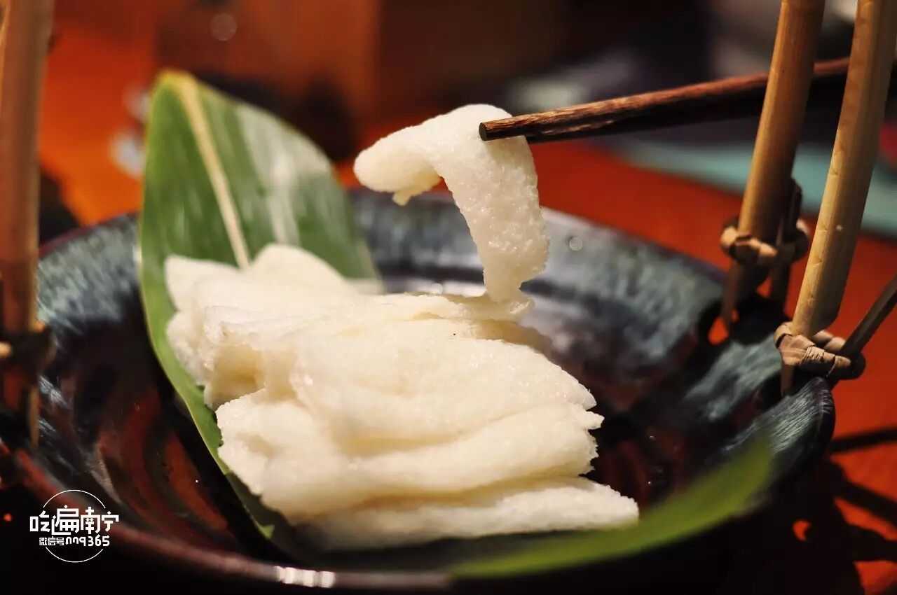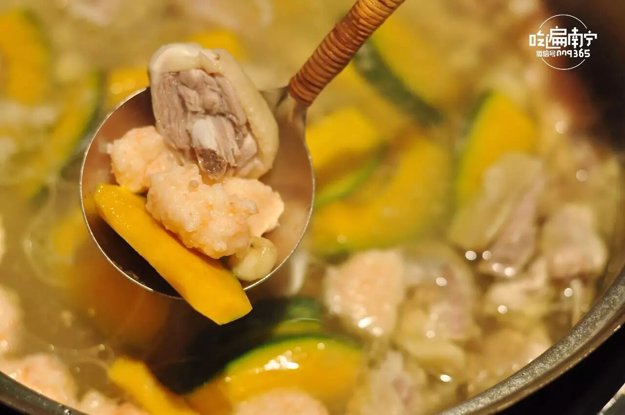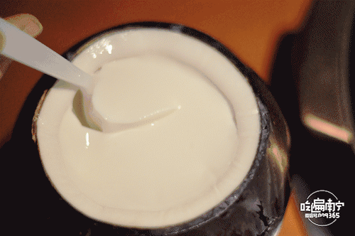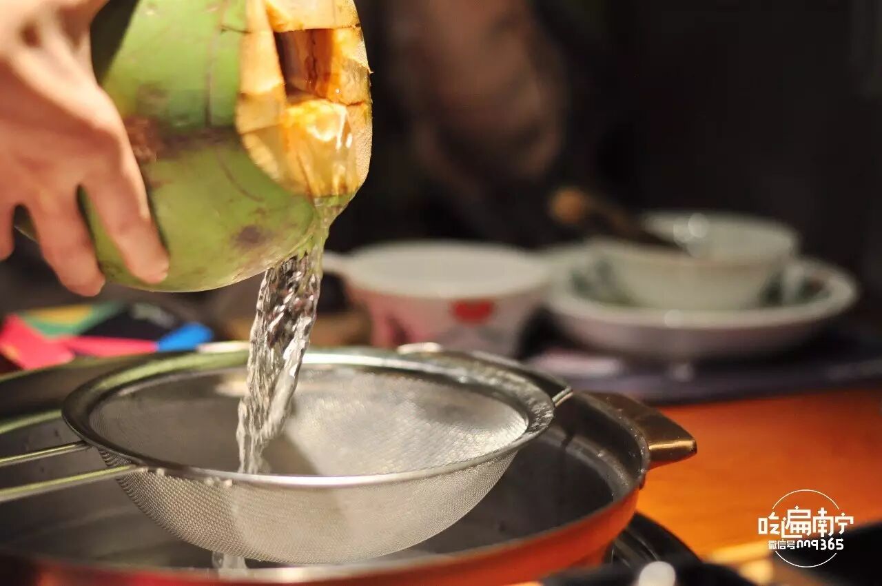 漏勺的作用是测量水位。服务员会在顾客面前现开三个椰青直接倒入锅底作汤底,这就是椰妹独一无二的原生态吃法。