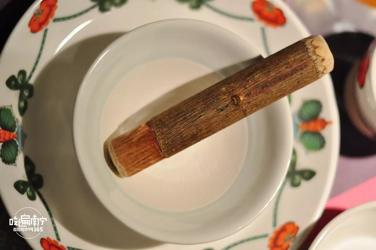 每个人的碗里都放有这样一根短而粗的木头,它是用来调料的。而且要自己动手!