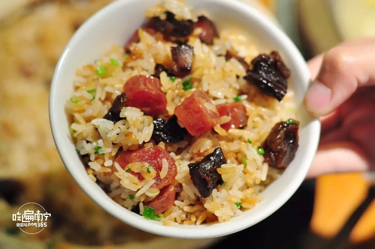 超大颗的腊肉和腊肠,经过葱花酱油的搭配搅拌,更加香气四溢!