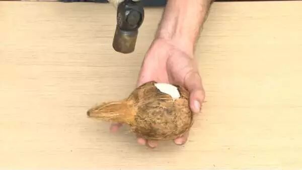 因为椰子经过冷冻后再用来敲打,所以会有裂缝出现,将很脆的椰子壳剥掉后,椰肉就出来了!