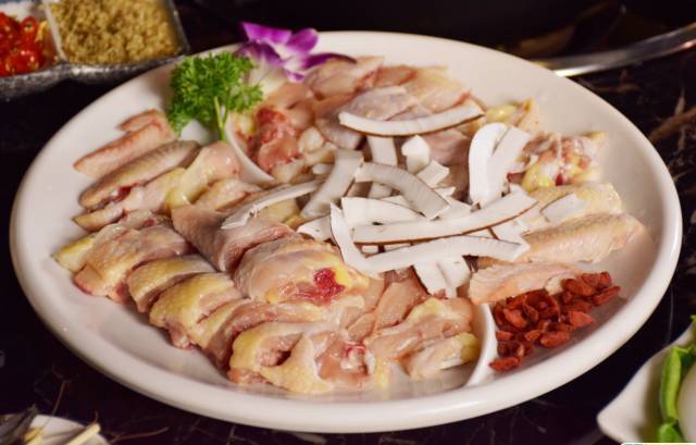为了使鸡肉更加香美,在宰杀前30天的育肥期内,必须用花生饼、椰子饼、椰丝、蕃茨、大米饭混淆着喂,饲料中必须加入适量花生油、鱼肝油和硫黄等配料。经过这样的特殊培育,肉质自然美味,再加上以椰青作为汤底,入口更加香甜没异味。