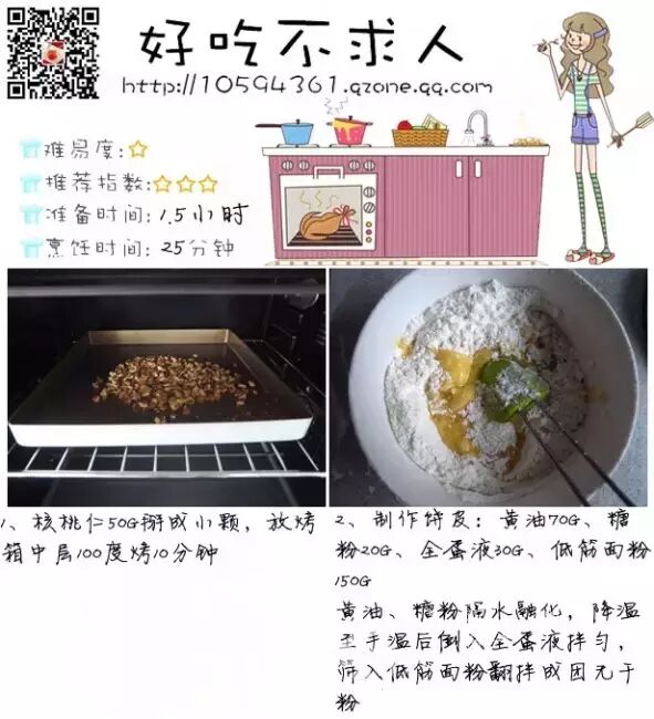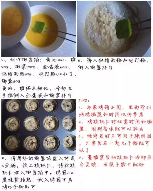 回来后想着试做,第二次做的时候觉得只有椰蓉的椰子饼少了些口感层次,这是第三次做,加了核桃仁,口感层次出来了,貌似椰子味却不那么浓郁了,做法先贴出来吧,有兴趣的朋友也可以试试,喜欢浓郁味道的,做全椰蓉,省略5、6步骤,喜欢多点口感层次的,按部就班。