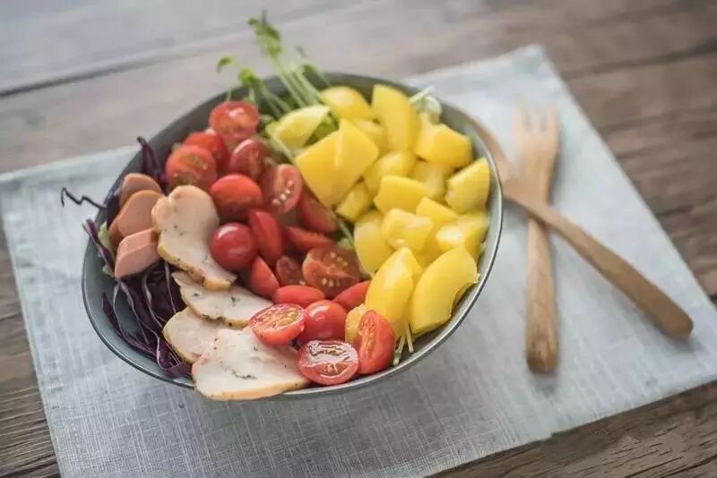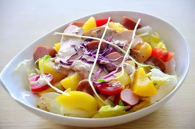 黄桃烤肠熏鸡沙拉,食材丰富,营养均衡,是非常好的减肥餐。沙拉配上黄桃,烤肠,熏鸡肉等低热量,高蛋白,是健身房最爱的食谱。吃起来口感脆爽,肉香浓郁。