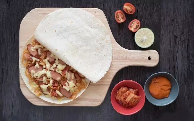 煎饼里面是肉馅儿和满满的芝士,奶香十足,搭配蜂蜜芥末酱,好吃不腻一人独吞一份都没问题。