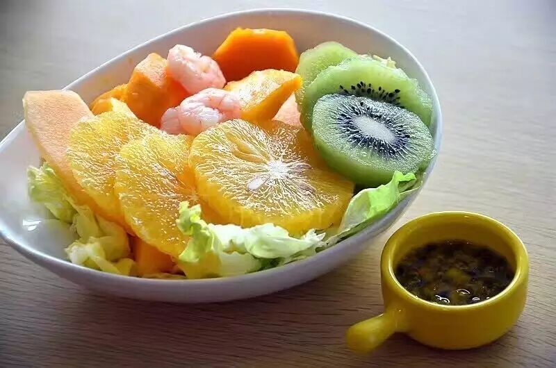 水果虾仁沙拉,水果品种丰富,色彩缤纷,新鲜水灵,大块甜美,虾仁饱满Q弹,鲜甜可口,好看又好吃的一道沙拉。