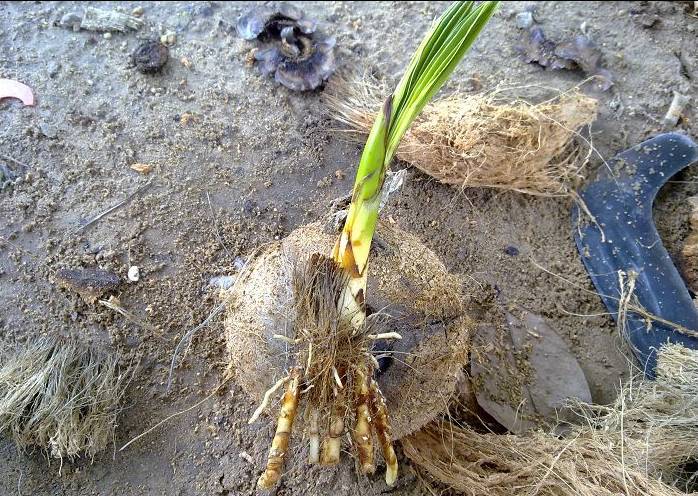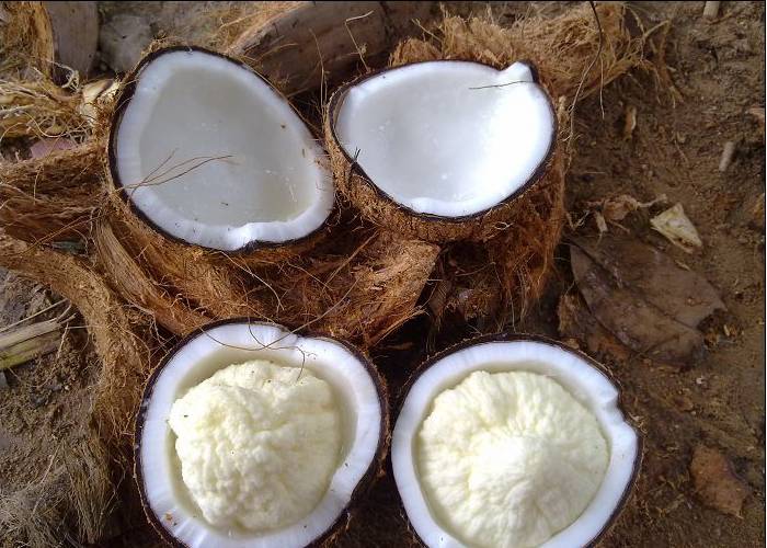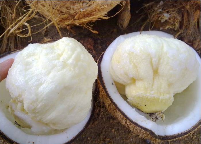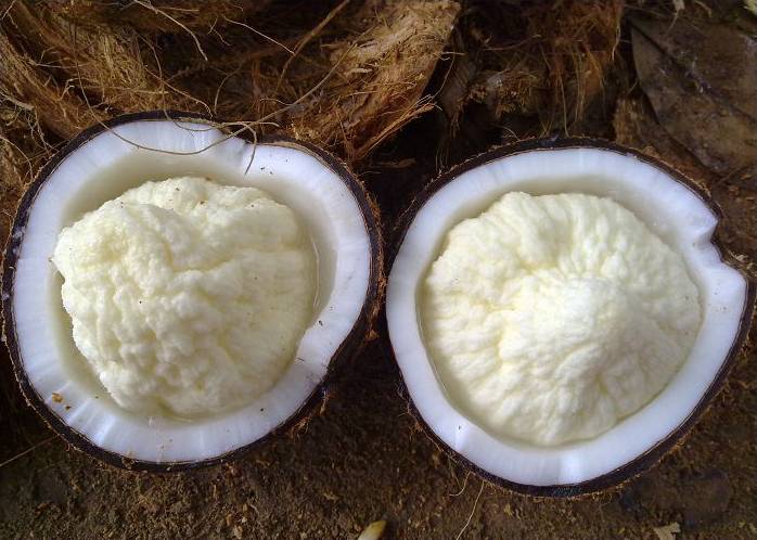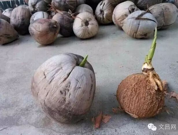 老椰子发芽了,椰子内会长出白色或浅黄白色的椰肉球体,叫椰子心,而这种椰子名为长芽椰。长芽椰就是长出椰芽叶子和椰根的椰子。每一个椰子都是一颗种子,放久后,从椰子下端的3个洞中,会有一个洞中长出根及叶芽。这个时候椰汁已经不再存在,完全形成养分,在中心长成一个海绵一样的椰子心,同时椰肉也将部分养分长到了椰子心中。椰子心香甜,状如海绵,奶香扑鼻,靠近椰宝处形成一层椰油结晶,再外面是变薄了很多的椰肉,十分好吃。