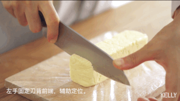 饼干切成厚薄均匀的片状。
