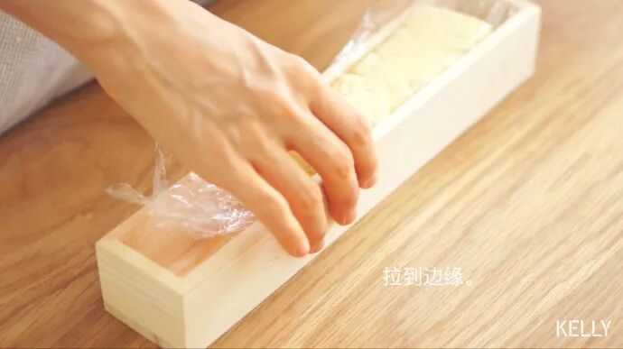 翻转饼干,拉动保鲜膜把饼干拉到一侧。