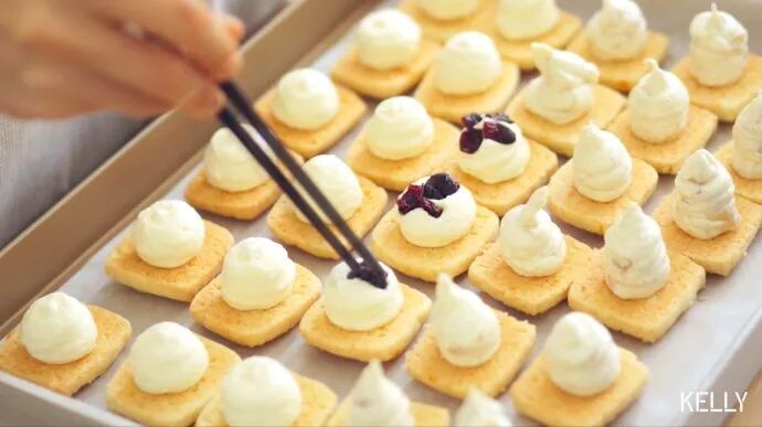 如果只想做8块蔓越莓馅饼,不要下香蕉,按括号前的分量操作,挤完放上蔓越莓干即可。