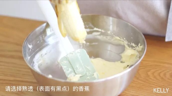 接下来制作香蕉奶酪霜。剥下一根香蕉到剩余的乳酪糊里。