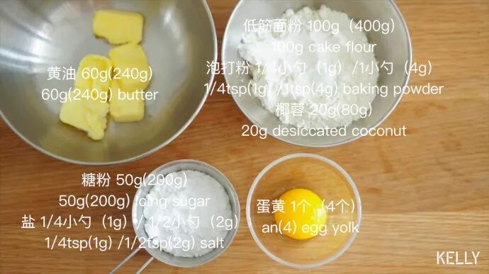 (括号前的分量与前文对应,可制作8块饼干;括号内的分量可制作32块)