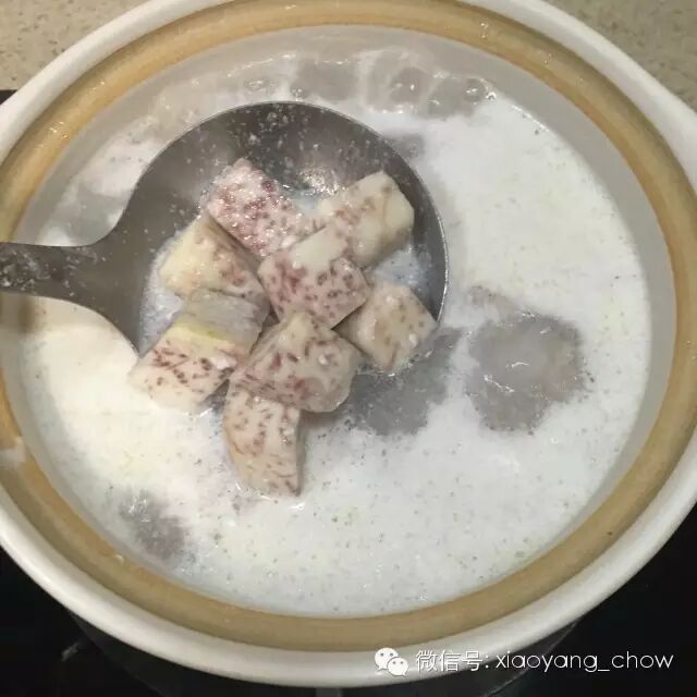 吃|饭桌万人迷:椰汁鲜芋芡实煲 2023-04-19 23:50:29 周末又到啦小羊又屁颠屁颠的跑回家了还是家里好呀今天中午和羊外公羊外婆一起在家吃饭在羊妈妈的特约指导下做了这道 椰汁鲜芋芡实煲 原料:芋头鲜百合鲜芡实椰浆【不是椰树牌椰汁喔】芡实和百合挑洗干净放在一边备用芋头刨皮切成1.5立方厘米左右的方块不要太小喔锅里放稍多一些油倒入芋头块煎到表面金黄铲出煎过的芋头比较好定型不会一煮就烂芋头比较吃水所以在砂锅内放入大半锅水烧开后按个人口味化入适量椰浆等锅再次烧开倒入煎好的芋头和新鲜的芡实中小火煮煮大概十五二十分钟等芋头变软糯倒入鲜百合稍煮一下就可以关火啦这样百合会比较脆甜爽口完成!这道菜最适合一家老小在家做饭的时候吃了芋头香糯软烂牙口不好的老人年纪小的宝宝都能吃也不用担心油腻上火像我一样多放点水还能每人舀一小碗汤喝这次拿了一个大砂锅煮为了好看些用碗盛了拍照其实整大锅连汤带渣被消灭的干干净净大家都吃了好多一直说好吃好吃羊外公赞不绝口晚上还专门又和我强调中午做的很好吃喔!。像小羊家这种比较传统的中国家庭年轻人爱吃的西餐日料什么的长辈们是不太接受的这道菜虽然很平淡普通可是非常保险大家都会喜欢的!各位快记下来回家的时候给家人露一手吧!=)小羊儿有酒有肉好朋友微信号:xiaoyang_chow