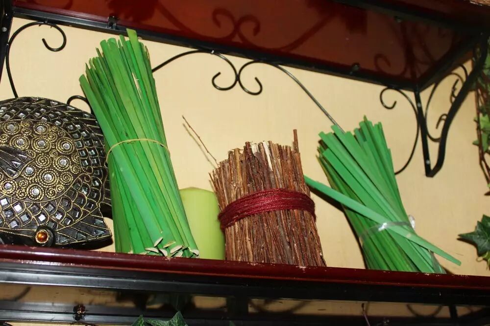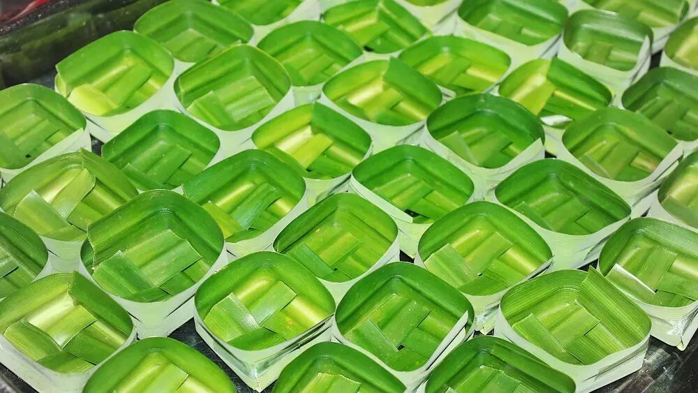 新鲜采摘的班兰叶色泽翠绿。店里的小哥不仅帅气,还有擅长编织的巧手,弹指间一条条叶片就变成了精致小巧的叶壳。