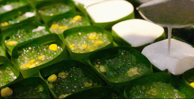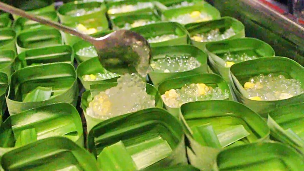 叶条除了做容器外,还要和其他食材一起烹煮。在特定的火候下,芳香物质才会彻底释放出来。煮好的西米饱满Q弹,充分吸收了班兰叶的草本清香