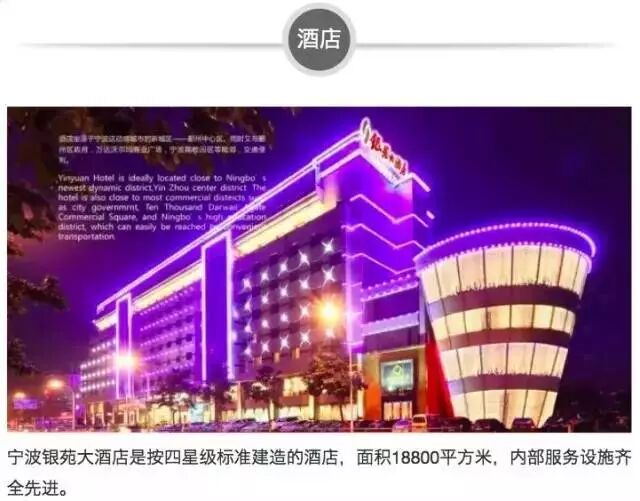 宁波银苑大酒店是按四星级标准建造的酒店,面积18800平方米,内部服务设施齐全先进。
