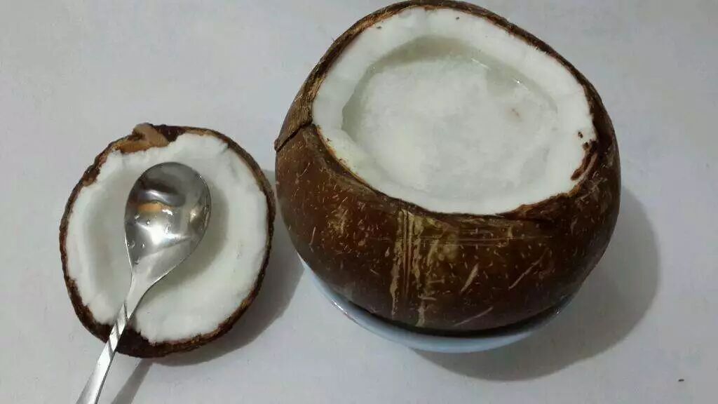 椰子剖开,里面那清水就是椰汁,但是我们平常买的椰奶,是把里面白色的果肉加在一起榨的。