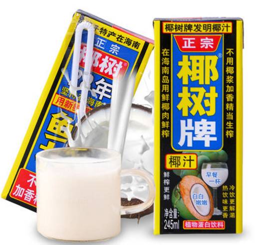 1:椰树牌的,这个打小就喜欢,小时候只有逢年过节才可以喝饮料,最喜欢喝的就是椰汁,尤其是冬天用开水温热了之后,觉得可美啦。可是很奇怪,长大了,却想不起来买这个,就是你知道有椰汁这种饮料,可是如果你去超市想着买饮料的话,你大概想不起来这个。